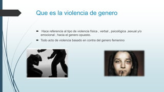 La violencia de género se refiere a la violencia física, verbal, psicológica, sexual o emocional hacia el género opuesto. Existen diferentes tipos de violencia de género como la psicológica, física, patrimonial, económica y sexual. Aunque existen mitos que justifican la violencia, las causas reales incluyen el control social de la mujer y patrones de conducta aprendidos. La prevención debe comenzar con la educación desde una edad temprana para promover relaciones de respeto e
