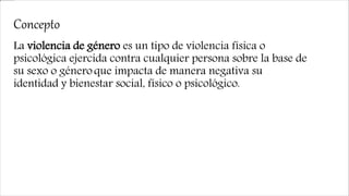 La violencia de género incluye violencia física, psicológica y sexual contra mujeres y puede ocurrir en el ámbito doméstico, laboral u obstétrico. Existen diferentes etapas de violencia que van desde amenazas e intimidación hasta agresiones graves y potencialmente mortales. Las víctimas a menudo no denuncian por miedo a represalias, amenazas contra sus hijos, dependencia emocional o culpa. Los maltratadores usan tácticas como negar los hechos, culpar a la víctima