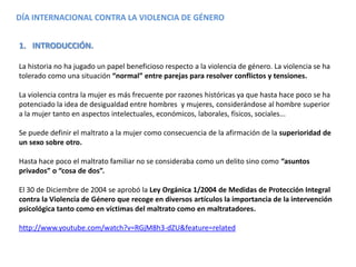 Este documento trata sobre la violencia de género y el maltrato doméstico. Explica que la violencia contra la mujer ha sido tolerada históricamente y define los diferentes tipos de maltrato, incluyendo el físico, psicológico y económico. También describe los ciclos típicos de la violencia doméstica, los perfiles de víctimas y maltratadores, y los obstáculos que enfrentan las víctimas para denunciar el abuso.
