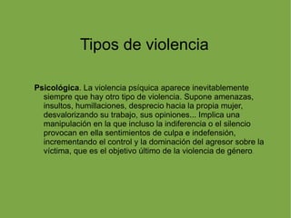 Este documento describe los diferentes tipos de violencia de género, incluyendo la violencia psicológica, física, sexual, económica y social. También discute que la violencia contra la mujer es el resultado de la histórica subordinación de la mujer en la familia patriarcal y puede ocurrir en diferentes ámbitos como el familiar, laboral y educativo, pero adquiere mayor dramatismo en el ámbito doméstico y de la pareja donde las mujeres son asesinadas anualmente por sus parejas.