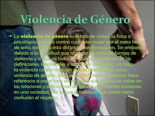 El documento describe los diferentes tipos de violencia de género, incluyendo la violencia física, psíquica, sexual, económica y social. Explica que la violencia física deja marcas visibles y ha sido la forma más reconocida, mientras que la violencia psíquica implica manipulación y control. También cubre la violencia sexual y económica, así como el aislamiento social que constituye la violencia social. Por último, proporciona datos sobre los porcentajes de violencia de género en diferentes países y tipos de relaciones