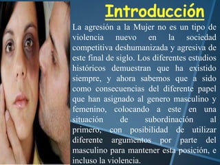 El documento describe la historia de la agresión a la mujer y cómo ha sido consecuencia de los roles de género asignados que subordinan a la mujer. Define el síndrome de agresión a la mujer y sus tres ámbitos principales (violencia doméstica, agresión sexual y acoso laboral). También describe los rasgos de las mujeres maltratadas, las características del maltrato doméstico y sus consecuencias físicas y psicológicas.