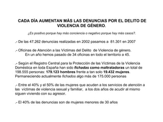 El documento presenta datos sobre la violencia de género en España, incluyendo el número de mujeres asesinadas por año, las denuncias realizadas y las detenciones. También describe programas de reeducación para agresores y analiza las causas y soluciones posibles para este problema, proponiendo un cambio de modelo social y la corresponsabilidad de hombres, mujeres e instituciones para promover la igualdad entre los géneros.