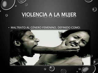El documento trata sobre la violencia doméstica contra la mujer en México. Explica que este tipo de violencia incluye el maltrato físico, emocional, sexual o financiero de la mujer por parte de su pareja, y que factores como el machismo y la misoginia son responsables. También discute cómo la violencia doméstica ha existido desde las sociedades patriarcales antiguas para controlar a las mujeres, y cómo en México persiste el problema a pesar de las leyes contra el feminicidio.