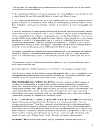 Este documento resume la violencia escolar y el acoso entre compañeros (bullying) en España. Explica que el acoso escolar ha sido estudiado desde los años 1970 y que afecta a casi un 6% de los estudiantes españoles. También describe los diferentes tipos de violencia escolar como el maltrato entre compañeros, el vandalismo, los daños físicos y el acoso sexual. Finalmente, ofrece cifras sobre la prevalencia del bullying en España, incluyendo que el 90% de los estudiantes han presenciado este comportamiento.