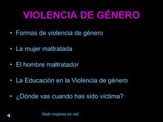 El documento habla sobre la violencia de género y proporciona información sobre sus diferentes formas, el perfil típico de una mujer maltratada y de un hombre maltratador, la importancia de la educación desde la infancia en la igualdad de género para prevenir la violencia, y los recursos disponibles para las víctimas como los centros de la mujer y el teléfono de emergencia 016.