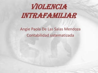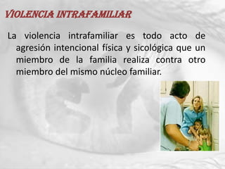 Este documento describe los diferentes tipos de violencia intrafamiliar, incluyendo la violencia psicológica, la violencia familiar, la violencia contra la mujer en la pareja y la violencia contra el hombre en la pareja. Explica las fases de la dinámica de la violencia intrafamiliar y los factores y personalidad del agresor.