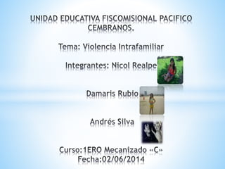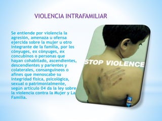 Este documento define la violencia intrafamiliar y sus principales causas. Señala que la violencia intrafamiliar incluye el abuso físico, emocional y sexual entre cónyuges, ex cónyuges y otros familiares. Generalmente ocurre en un ciclo de tres fases: acumulación de tensión, episodio agudo de violencia y etapa de calma/arrepentimiento. Los factores que contribuyen incluyen la falta de control de impulsos, carencia afectiva e incapacidad para resolver problemas. La prevención requiere escuchar a las ví