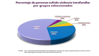 Este documento discute la violencia intrafamiliar en México. Define la violencia como el abuso de poder que causa daño, y la violencia intrafamiliar como el abuso sistemático entre miembros de una familia. Explora los tipos de violencia, incluyendo emocional, física, sexual y económica. Presenta estadísticas que muestran que el 60% de las mujeres en México han sufrido abuso psicológico. Propone soluciones como terapia familiar y mejorar la comunicación y el respeto entre los miembros de la familia.