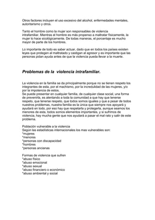 La violencia intrafamiliar se refiere al abuso de poder de un miembro de la familia sobre otro e incluye maltrato físico, psicológico y de otros tipos. Las víctimas más comunes son las mujeres, los niños, las personas con discapacidad y las personas mayores. Los factores que contribuyen a la violencia incluyen experiencias de violencia en la infancia, estrés, uso de sustancias y problemas económicos. La violencia intrafamiliar tiene graves efectos psicológicos y físicos sobre las víctimas.