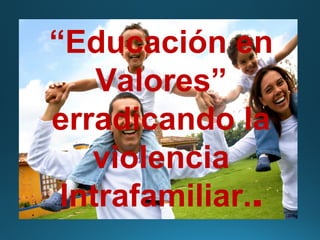 Este documento describe un taller de una sesión dirigido a padres y madres para educar sobre valores y erradicar la violencia intrafamiliar. El objetivo principal es identificar formas de afrontar y resolver dificultades familiares de manera no violenta. Se presentan estadísticas sobre el aumento de denuncias por violencia doméstica en el país y sus causas. La sesión incluye videos, dinámicas grupales y discusiones para crear conciencia sobre este problema y enseñar habilidades que promuevan el diálogo y la conviv