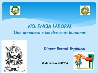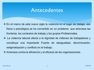 Este documento resume la violencia laboral como un problema que amenaza los derechos humanos y el trabajo digno. Define la violencia laboral como incidentes físicos o psicológicos que afectan la dignidad de los trabajadores. Explica que la violencia laboral incluye acoso sexual, acoso moral y agresiones físicas. Finalmente, concluye que la violencia laboral no discrimina y que el acoso moral es inmoral.