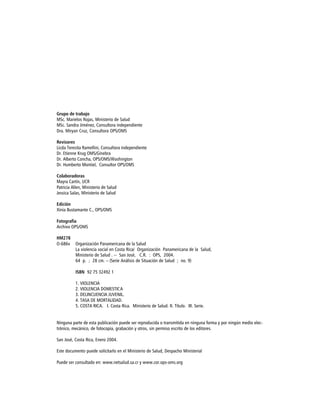 Este documento resume la magnitud y tendencia de la violencia en Costa Rica según datos de mortalidad en las últimas décadas. Encuentra que la violencia es la tercera causa de muerte en el país y que las tasas de mortalidad por causas violentas como homicidios, suicidios y accidentes de tránsito han aumentado significativamente en los últimos años. Identifica diversos tipos de violencia como delitos violentos, delincuencia juvenil, violencia intrafamiliar y comunitaria como problemas crecientes en la sociedad costarricense. Finalmente, analiza algunos de