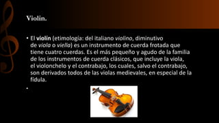 El violín es el instrumento más pequeño y agudo de la familia de cuerdas, tiene cuatro cuerdas afinadas por intervalos de quintas. Además del efecto logrado por el arco, se pueden conseguir otros efectos como pizzicato, trémolo o vibrato. El violín tiene partes como la voluta, el mango, el diapasón y el fondo. La primera cuerda en ser afinada es la del la a una frecuencia de 440 Hz usando un diapasón como referencia.