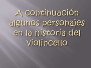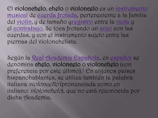 El violonchelo es un instrumento musical de cuerda frotada del tamaño de una viola, que se toca entre las piernas sujetándolo con el brazo izquierdo y frotando las cuerdas con el arco con la mano derecha. Originariamente desarrollado en Italia en el siglo XVII como miembro de la familia del violín, el violonchelo ha sido un instrumento importante en la música clásica y muchas obras han sido compuestas para él a lo largo de la historia.