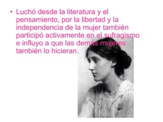 Virginia Woolf fue una escritora británica del siglo XX que luchó por la libertad y la independencia de la mujer a través de su literatura y pensamiento, participando activamente en el sufragismo. Tuvo una vida personal difícil marcada por la depresión que terminó en su suicidio. Algunas de sus obras más destacadas fueron "Orlando" y "Las Olas".