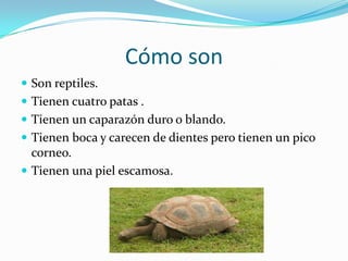Las tortugas son reptiles con cuatro patas, caparazón y piel escamosa. Viven tanto en el mar como en la tierra, y sus hábitats favoritos son cálidos. Pueden vivir décadas e incluso siglos. Se alimentan de plantas o animales dependiendo del hábitat, y se reproducen depositando huevos en la arena.
