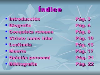 El documento describe la biografía de Viriato, un pastor lusitano que se convirtió en líder de la resistencia contra la conquista romana de Lusitania en el siglo II a.C. Detalla sus victorias militares contra los romanos y cómo logró unir a varias tribus ibéricas contra ellos. Sin embargo, Viriato fue traicionado y asesinado por sus propios generales, quienes habían sido sobornados por los romanos.