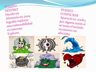 Un virus es un programa malicioso que puede dañar computadoras. Los virus más conocidos incluyen el Viernes 13, Cascade y Melissa. Pueden causar efectos no destructivos como mensajes en la pantalla o destructivos como la eliminación de archivos o el formateo de discos duros. Es importante usar programas antivirus y seguir normas básicas de seguridad para protegerse de los virus.
