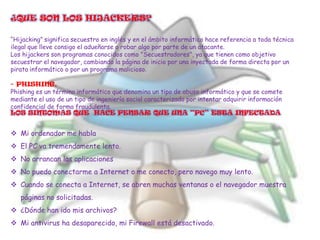 Este documento define y describe varios tipos de malware informático, incluyendo virus, troyanos, gusanos, spyware, keyloggers, hijackers y phishing. También identifica síntomas comunes de infecciones y proporciona consejos sobre cómo protegerse, como mantener los antivirus actualizados, evitar descargas no seguras y usar cortafuegos.