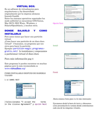 Este programa permite crear máquinas virtuales para ejecutar sistemas operativos de forma aislada. Explica cómo crear una partición virtual, descargar e instalar VirtualBox de su página web, y guía al usuario paso a paso en la creación de una nueva máquina virtual para instalar un sistema operativo como Ubuntu.