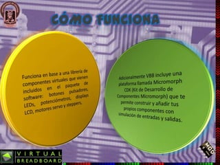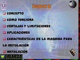 El documento describe el software Virtual BreadBoard, que es un entorno de simulación para microcontroladores que puede reemplazar un protoboard real. Explica cómo instalar el software en una máquina con un procesador dual de 2.1 GHz y 2 GB de RAM con un sistema operativo de 32 bits. Detalla los pasos para insertar el disco, ubicar el instalador, ejecutarlo y completar la instalación con éxito para poder usar el programa.