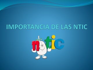 El documento define las NTIC como el conjunto de tecnologías para gestionar y enviar información, incluyendo tecnologías para almacenar, recuperar, enviar e información y procesar datos. Explica la importancia de las NTIC en la educación, las empresas y la sociedad, permitiendo mejorar la competitividad, facilitar proyectos, mejorar el manejo de información, aumentar la productividad, permitir comunicación global y el intercambio de información educativa. Finalmente, enfatiza la necesidad de aprovechar las herramientas de las NTIC para