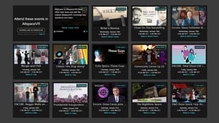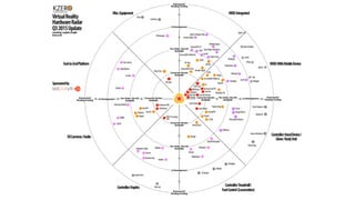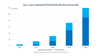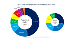 El documento describe la historia y el estado actual de la realidad virtual y la realidad aumentada. Explica las diferencias entre VR y AR, así como los dispositivos de hardware y software utilizados. También analiza las principales aplicaciones y tendencias de mercado de la VR y la AR, incluidos los juegos, la educación, los museos y las exhibiciones.