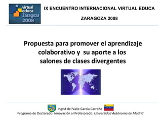 La propuesta busca promover el aprendizaje colaborativo en salones de clase diversos mediante el uso de estrategias didácticas colaborativas. Esto se justifica por los beneficios del aprendizaje colaborativo en el desarrollo de habilidades cognitivas, sociales y valores. La propuesta incluye capacitar docentes, incorporar estas estrategias en los planes de estudio e implementar métodos colaborativos como aprendizaje basado en problemas.