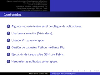 El documento describe herramientas para el despliegue de aplicaciones Python como VirtualEnv, Pip y Fabric. VirtualEnv crea entornos virtuales independientes para instalar paquetes. Pip gestiona paquetes Python e instala dependencias. Fabric ejecuta tareas remotamente a través de SSH. Juntos estas herramientas permiten el despliegue y mantenimiento de aplicaciones Python de forma aislada y automatizada.