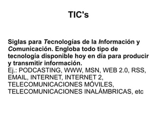 Este documento describe las Tecnologías de la Información y la Comunicación (TIC) y su aplicación en la educación. Menciona ejemplos de TIC como podcasting, correo electrónico e Internet y cómo herramientas digitales como los sistemas de gestión de aprendizaje, blogs, wikis y bases de datos pueden usarse para producir y compartir contenido educativo. También resalta recursos TIC específicos de la Universidad Técnica Particular de Loja, como su página de inicio, sistema de evaluación virtual, biblioteca virtual, repos