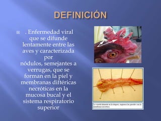 La viruela aviar es una enfermedad viral común de las aves causada por el virus Variola avium. Se manifiesta de dos formas: cutánea, con lesiones en la piel, y diftérica, con membranas en las vías respiratorias. Se transmite por contacto directo entre aves o por vectores como mosquitos. Su control incluye vacunación, aislamiento de aves enfermas y descontaminación de objetos contaminados.