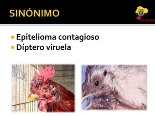 El epitelioma contagioso es una enfermedad viral que afecta a varias especies de aves, presentándose en dos formas: cutánea y diftérica. Tiene un alto nivel de mortalidad, especialmente en aves jóvenes, y causa disminuciones significativas en la producción y el bienestar de las aves. Se transmite principalmente a través de contacto directo y vectores como mosquitos, siendo necesario implementar programas de vacunación y medidas de control de vectores para su prevención.
