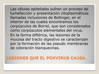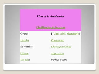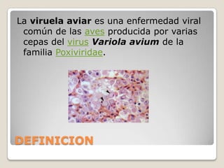 La viruela aviar es una enfermedad viral causada por el virus Variola avium que afecta a muchas especies de aves. Presenta formas cutánea, diftérica y cutáneo-diftérica, causando lesiones en la piel y membranas mucosas. Se transmite por contacto directo entre aves infectadas. Su diagnóstico requiere pruebas histopatológicas, de aislamiento viral o análisis de ADN, y su control incluye vacunación y medidas sanitarias.