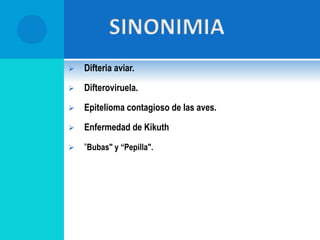 La viruela aviar es una enfermedad de las aves causada por el avipoxvirus, que se caracteriza por la formación de nódulos, pústulas y costras en áreas sin plumas. Puede presentarse en forma seca o húmeda. Se transmite por contacto directo o a través de mosquitos. Causa problemas económicos en la producción avícola. Su diagnóstico se realiza a través de exámenes clínicos y de laboratorio. El control incluye la vacunación y medidas sanitarias.