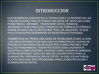 Este documento habla sobre los avances en tecnología y las comunicaciones y cómo esto ha traído tanto ventajas como problemas, especialmente los virus informáticos. Explica qué son los virus, cómo se infectan las computadoras, los diferentes tipos de virus, cómo funcionan los antivirus y cómo prevenir y eliminar virus. También describe las características que debe tener un buen antivirus y ejemplos de antivirus populares.