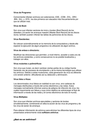 El documento describe varios tipos de virus informáticos como caballos de Troya, gusanos, virus de macros, virus de sobrescritura y virus de programa. También explica cómo funcionan los antivirus detectando y eliminando virus a través de métodos heurísticos y comparando atributos de archivos. Finalmente, resume que los antivirus han evolucionado para bloquear infecciones de virus y otros malware como spyware y rootkits.