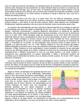 El documento describe la estructura y replicación de los virus. Explica que los virus son partículas compuestas de material genético envuelto en una cubierta proteica que se reproducen dentro de las células hospedadoras utilizando los mecanismos celulares. Menciona que los virus pueden causar enfermedades como la gripe, el herpes y algunos tipos de cáncer al dañar o destruir las células durante la replicación y liberación de nuevas partículas virales.