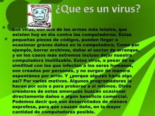 Los virus son pequeños códigos maliciosos creados por humanos que pueden dañar computadoras al borrar archivos, dañar sectores o dejar la computadora inutilizable. Existen diferentes tipos de virus como troyanos, gusanos, keyloggers y virus polimórficos, cada uno con características particulares pero todos con el potencial de causar daño.