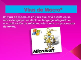 Este documento describe diferentes tipos de malware, incluyendo troyanos, gusanos, bombas lógicas, bulos, virus de broma, virus de macros, virus de arranque, código mutante, virus de IRC y armadura. Explica brevemente qué son cada uno de estos tipos de malware y cómo funcionan.