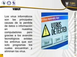 El documento habla sobre virus informáticos y vacunas informáticas. Explica que los virus informáticos son programas maliciosos que se replican a sí mismos e interfieren con computadoras, mientras que las vacunas informáticas son programas de seguridad que detectan y eliminan virus. También describe varios tipos comunes de virus e información sobre cómo funcionan los antivirus y las medidas para prevenir infecciones.