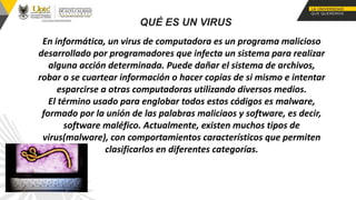 1) Los virus informáticos son programas maliciosos que infectan sistemas para realizar acciones dañinas como robar información o copiarse a otras computadoras.