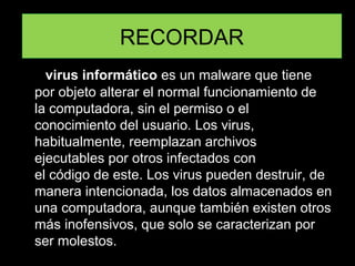 Este documento describe los diferentes tipos de virus informáticos y cómo se propagan. Explica que los virus son programas maliciosos que alteran el funcionamiento de las computadoras sin el permiso del usuario y que se pueden propagar a través del correo electrónico, descargas de internet o copiando archivos infectados. También menciona métodos para prevenir infecciones como usar programas antivirus y restringir el acceso a archivos.