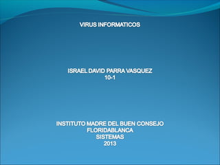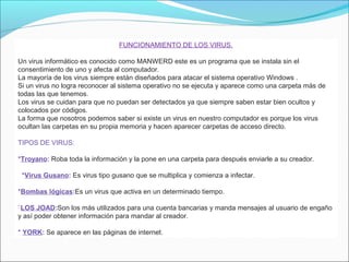 Un virus informático es un programa que se instala sin consentimiento y afecta al computador. Los virus se diseñan comúnmente para atacar sistemas Windows y se ocultan bien para evitar detección. Algunas formas de saber si hay un virus incluyen carpetas ocultas y accesos directos extraños. Los tipos de virus incluyen troyanos, gusanos, bombas lógicas y virus de phishing. Para eliminar virus, mantén el antivirus actualizado, usa programas antivirus en línea, y desconecta el equipo de Internet si un