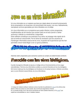 Un virus informático es un programa malicioso que se propaga infectando otros programas y alterando su funcionamiento de forma dañina, borrando archivos u obstaculizando el rendimiento del sistema. Los virus se parecen a los virus biológicos en que se introducen en el sistema sin permiso y se replican infectando más programas. Un ataque reciente a los servidores de publicidad de Yahoo propagó malware a decenas de miles de usuarios por hora a través de anuncios publicitarios maliciosos. Los sitios web de tecnología son más propensos a cont
