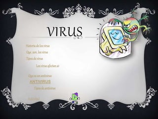 Este documento describe varios tipos de virus informáticos como gusanos, virus de macros, virus de sobreescritura y más. Explica también la historia de los virus y cómo se propagan. Se mencionan diferentes tipos de antivirus como Kaspersky, Norton y más. Los virus afectan principalmente a Windows y es importante contar con protección antivirus y seguir prácticas seguras para prevenir infecciones.