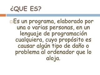 Este documento describe los diferentes tipos de virus informáticos, incluyendo virus de sector de arranque, virus de sistema, virus de archivo, virus de macro, virus polimórficos y virus adjuntos. Explica que los virus dependen de programas anfitriones para propagarse y cómo cada tipo funciona de manera diferente, por ejemplo, infectando el sector de arranque del disco o archivos ejecutables. También discute sobre troyanos, gusanos, dropper, bombas y hoaxes, programas dañinos similares a los virus.