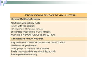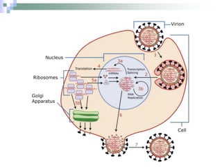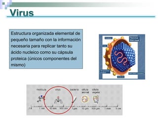 Los virus son pequeñas partículas infecciosas que contienen material genético y dependen de la maquinaria celular para replicarse. Pueden tener ADN o ARN, pero no ambos, y estar envueltos o no. Se replican en tres etapas: entrada en la célula, síntesis de proteínas y replicación del genoma, y liberación de nuevas partículas virales. Los virus causan diferentes efectos en las células como lisis, persistencia o transformación en células cancerosas.