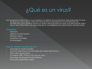 Los virus informáticos infectan archivos y sistemas operativos con el objetivo de dañar datos o alterar el funcionamiento del ordenador sin el consentimiento del usuario, propagándose a otros sistemas. Los antivirus detectan, bloquean y eliminan virus, actualizándose constantemente para combatir nuevas amenazas y proteger los sistemas. Existen diferentes tipos de malware como virus, troyanos, gusanos y spyware que usan diversos métodos para infectar equipos y robar información personal de usuarios.
