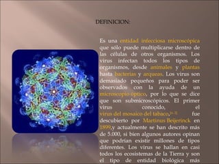 El documento define un virus como una entidad infecciosa microscópica que solo puede multiplicarse dentro de las células de otros organismos. Los virus infectan animales, plantas, bacterias y arqueas. Se cree que existen millones de tipos diferentes de virus en la Tierra. Los virus coevolucionan con sus huéspedes y tienden a no causar enfermedades cuando infectan a su huésped natural.
